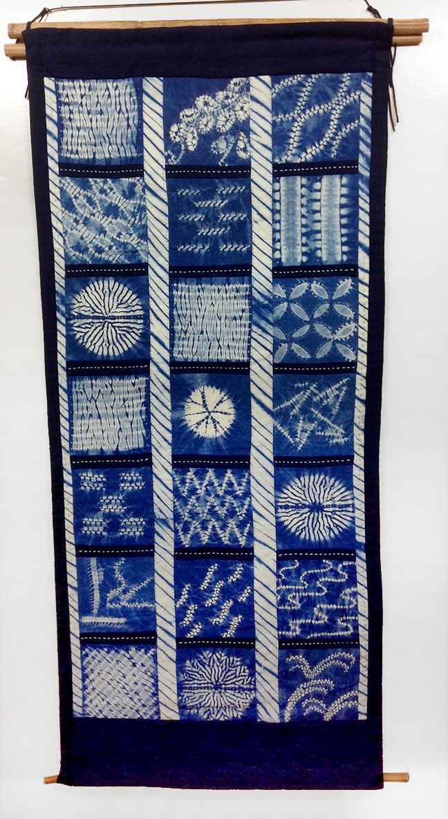 Wabi-Sabi I Published January 1, 2017 at 648 × 1185 Wall hanging. Various shibori patterns. Hemp, indigo. 2016. (sold)